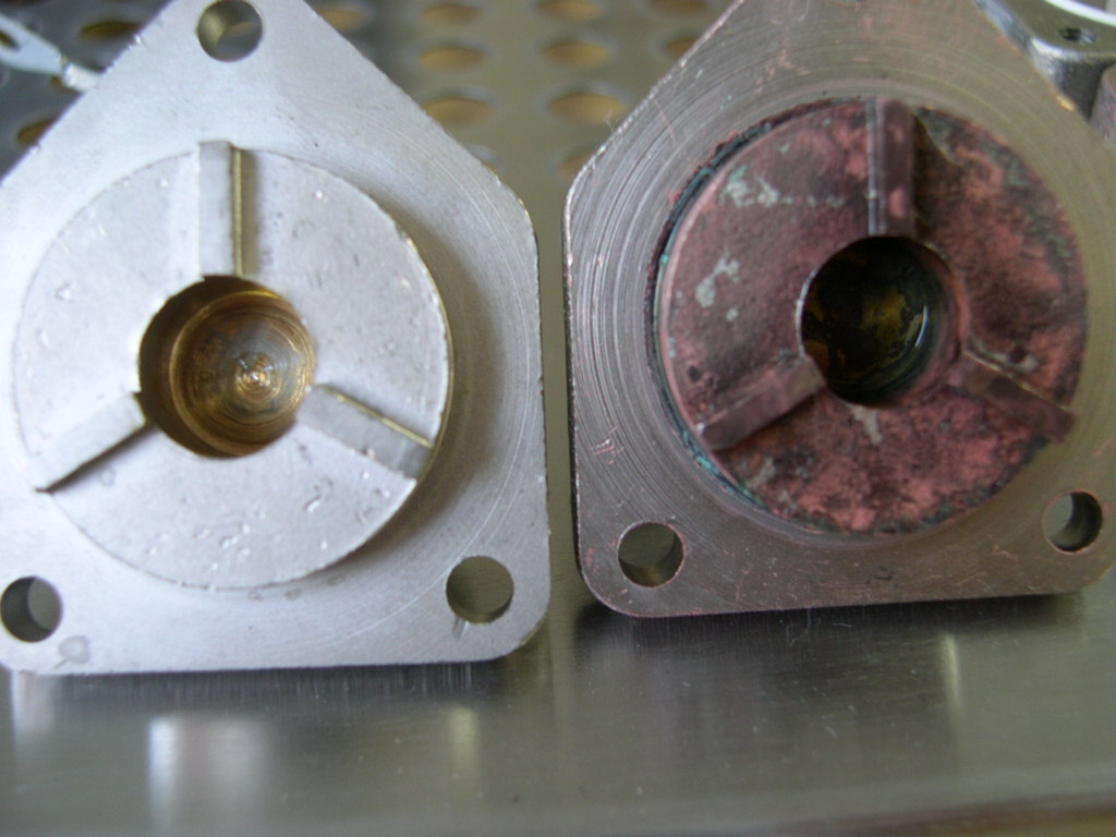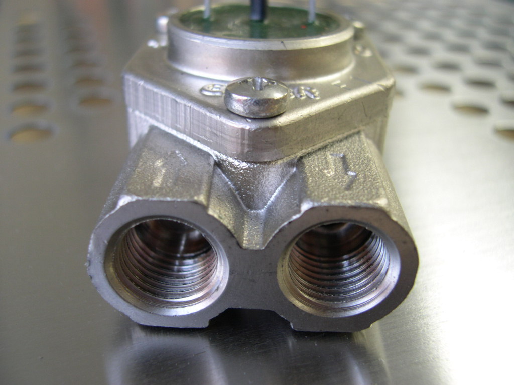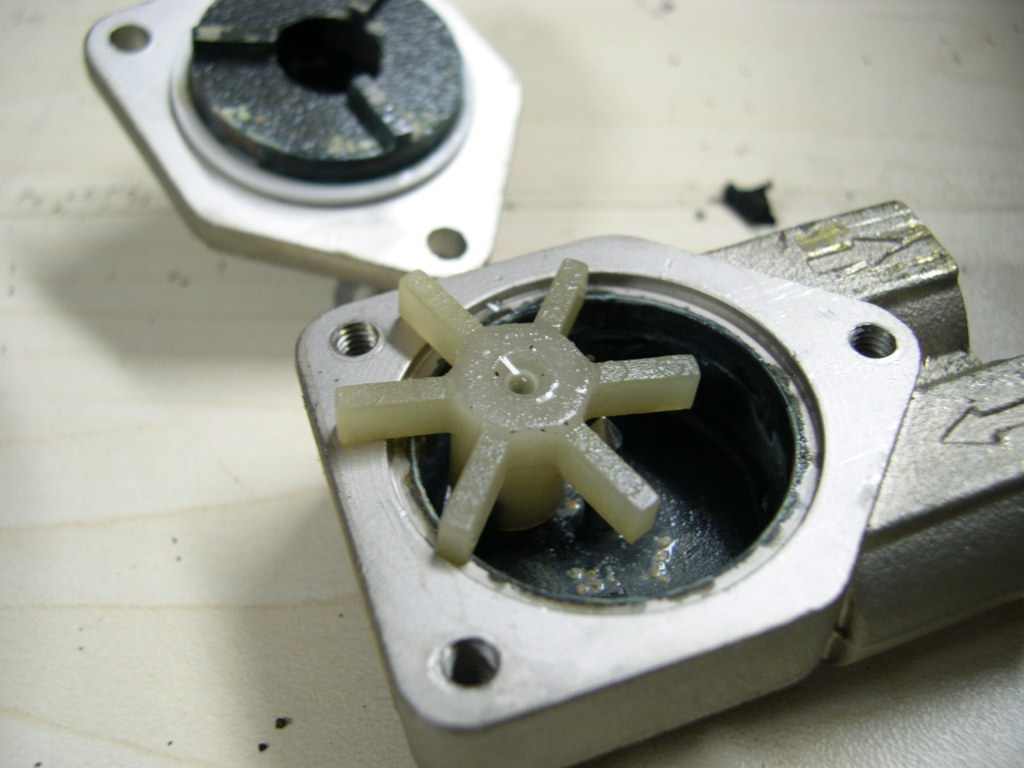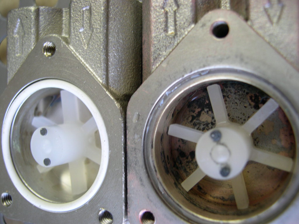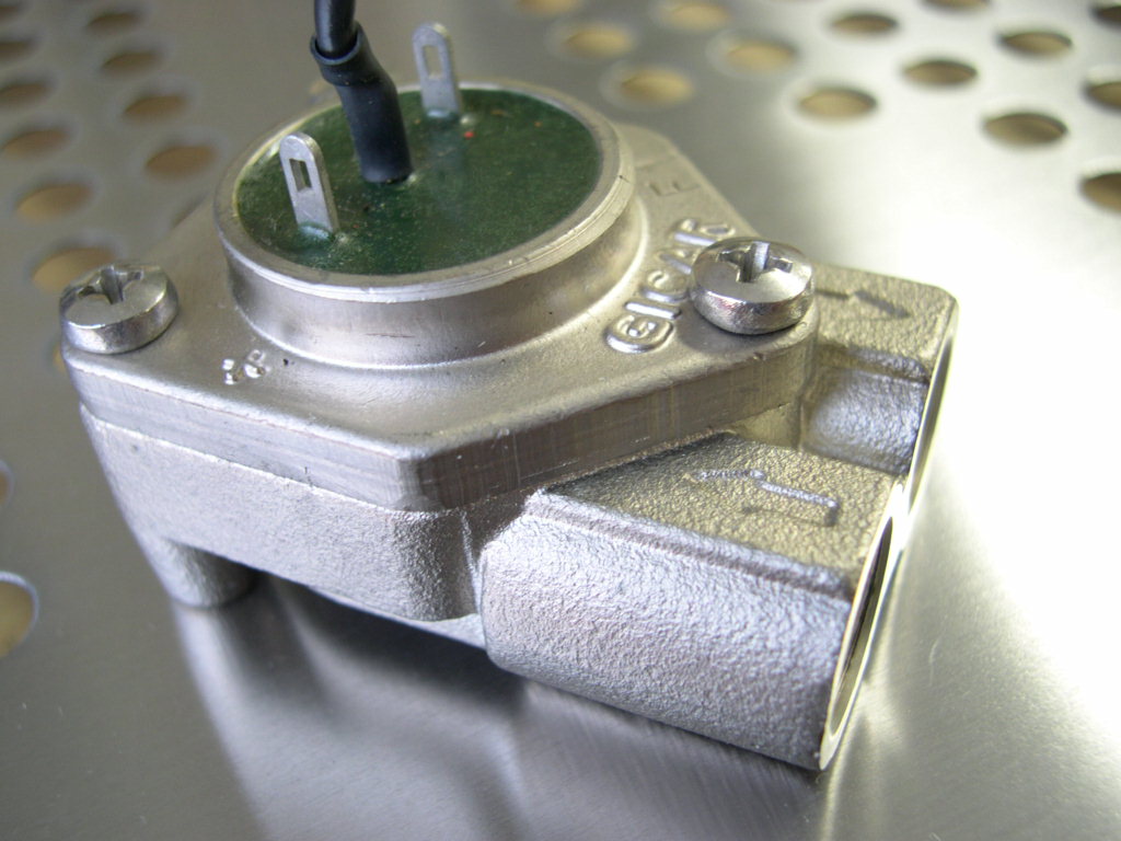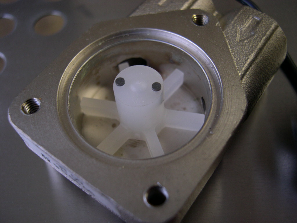 Problems and overhauling Flowmeters suffer from the same problems as most other components and that is limescale and dirt. Problem - Lack of flow from the groups Cause - Limescale and dirt will build-up over time and may have blocked the inlet of the flowmeter. Remedy - Turn water mains supply off and bleed off pressure. Remove the flowmeter and dismantle. Check the inlet and outlet holes for blockage (scale, dirt, teflon tape) and clear if necessary. Descaling and cleaning Now if you must descale then you have to be careful since the field sensor is fragile - especially the earth wire that will snap off if you are not careful. What I would do is take it apart and be gentle with it especially when removing the wires from the terminals. Also take care not to break the o-ring since you should be able to use it again. You can drop the main body into a descaling solution - but be warned the nickel plating may come off slightly. I would only leave it in a hot solution for about 20 mins. You could also drop the impeller in there for a few mins to remove some build up from around the magnets. The field sensor is fragile. I would try and remove the scale from the underside of the unit taking care not to get the terminals wet or damaged. So you must try and find a shallow dish so that the citric solution is only 1cm deep or so. Sometimes the field sensor will need replacing if the PC is reporting a blockage. A good flowmeter field senso should have an ohm reading of 2.2k between the "+" and "0" terminals. It should still be OK if the reading is between 1.8k and 2.4k. By far the most common fault with the field sensor is corrosion on the earth wire and the terminals. When these corrode they snap off very easily and you must replace the unit. |