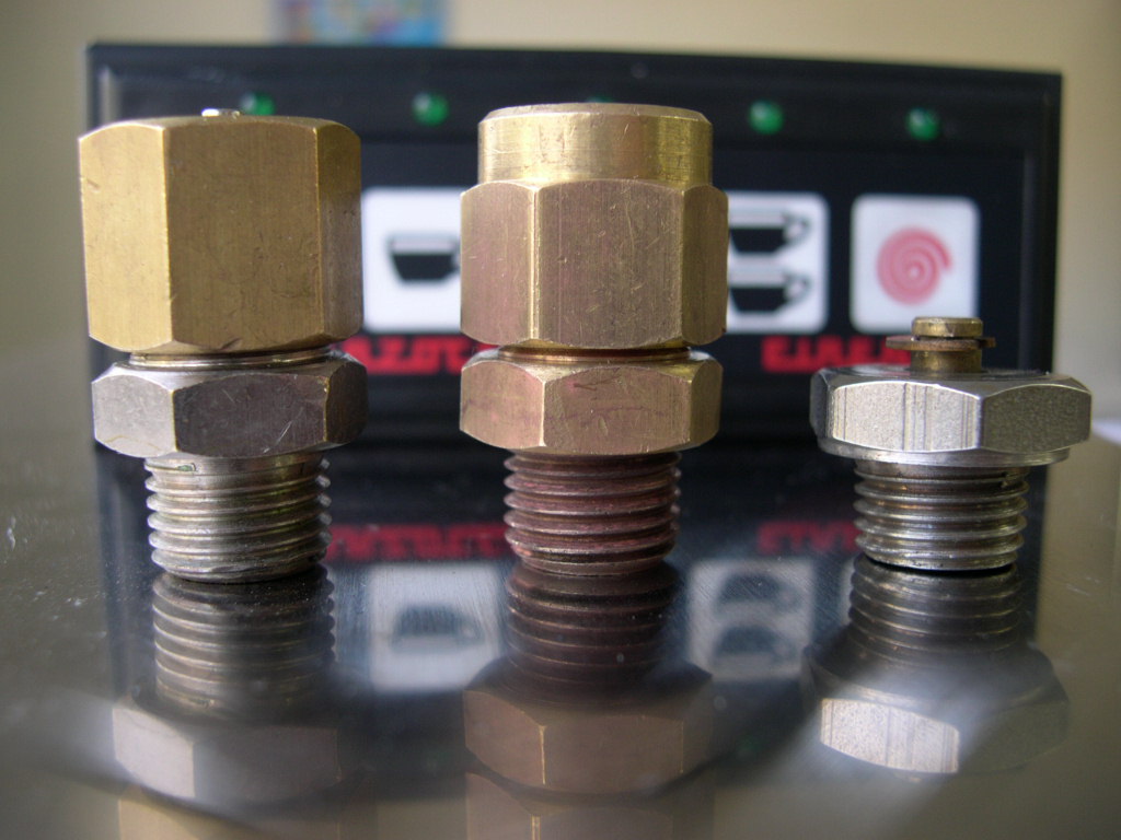 Problems and overhauling Vacuum breakers are one of the easiest components to diagnose and restore. Problem - Sounds like a snake is trapped inside the machine. Cause - 3 causes. 1. the washer or gasket sealing the breaker to the boiler has deteriorated over time - as we would expect. 2. the viton or silicone o-ring on the stem has deteriorated and cannot make a seal. 3. Limescale or dirt has been deposited on the top body of the breaker preventing the o-ring from making a seal. Remedy - A rebuild and new gaskets is necessary. Switch off machine and bleed off steam by opening steam valves. When pressure is at zero remove the valve. Take apart, clean, descale and replace o-ring and the gasket in between breaker and boiler. Problem - Gauge says 1.5bar but no steam when you open the valve - usually when you switch on the machine. Cause - Sticky stem, i.e. the stem is not dropping when the pressure drops. This is preventing the air escaping when it is first heating and creating a "false pressure". Sticky stems are caused by dirt, limescale and a bad o-ring. Remedy - As above, clean, descale, replace stem o-ring and replace the gasket in between breaker and boiler. Remember that the steam pressure inside a boiler is highly dangerous. Never touch the vacuum breaker without first depressurising first. |