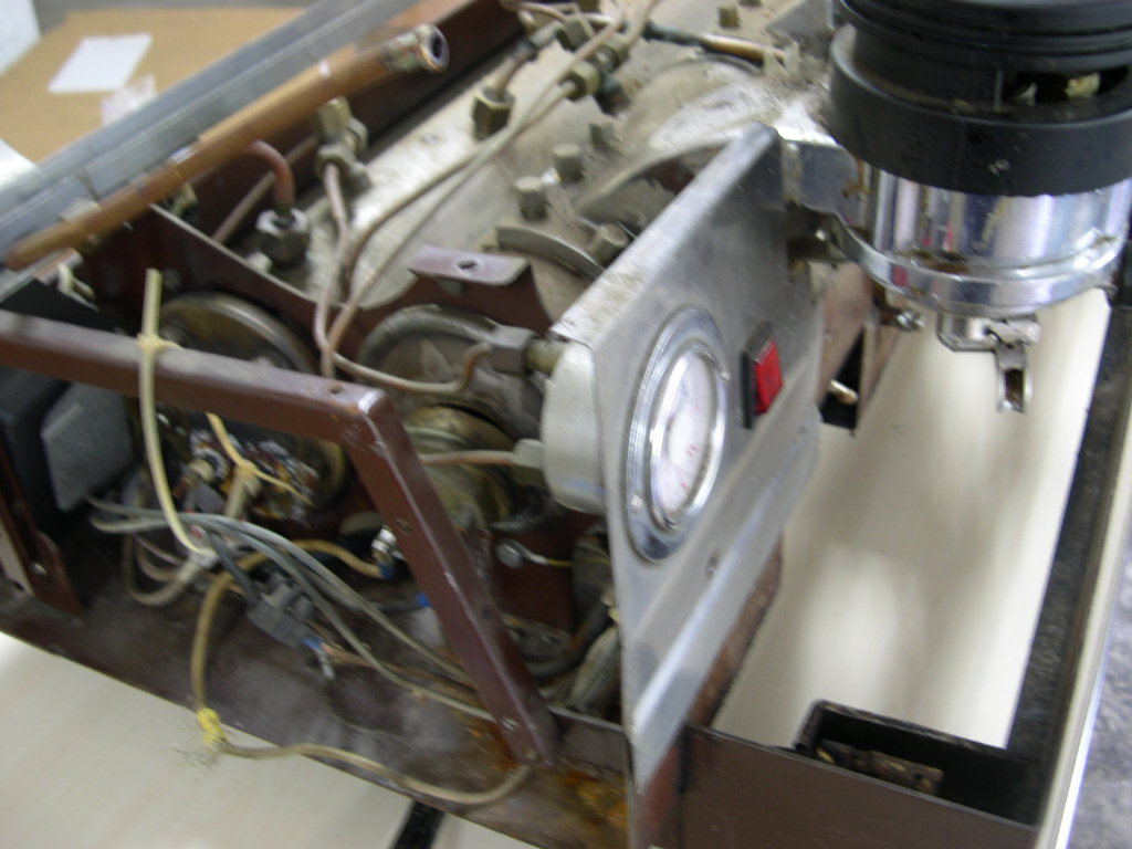 | Basic condition Well it was an adventure getting it to Hong Kong. Thanks must go to Bill Crossland at LMI for helping me get this from the seller to his office so he could pack it correctly. The machine was advertised as a non-runner and had some damage to the brew boiler as a result of water being left inside during winter storage. When it arrived some trim panels were hanging off, it was very dirty and scale was coming out from almost every orrifice. However the good part was that some now obsolete parts were in-tact, namely the bakelite group covers and handles. It is important to note that some of the pictures are not the best in terms of quality. It was an emotional day receiving and unpacking the machine. Taking good pictures didn`t even figure into the equation. |