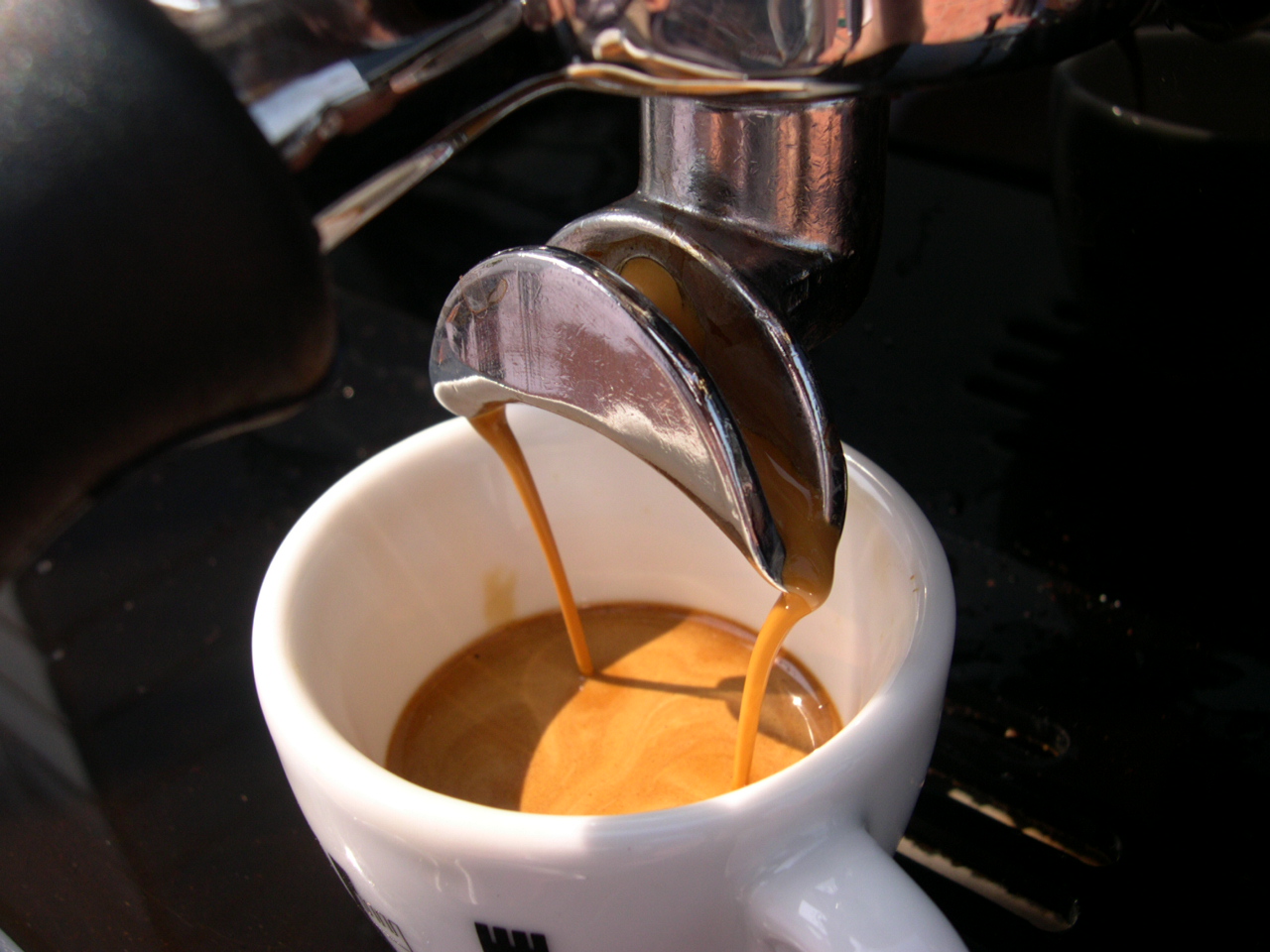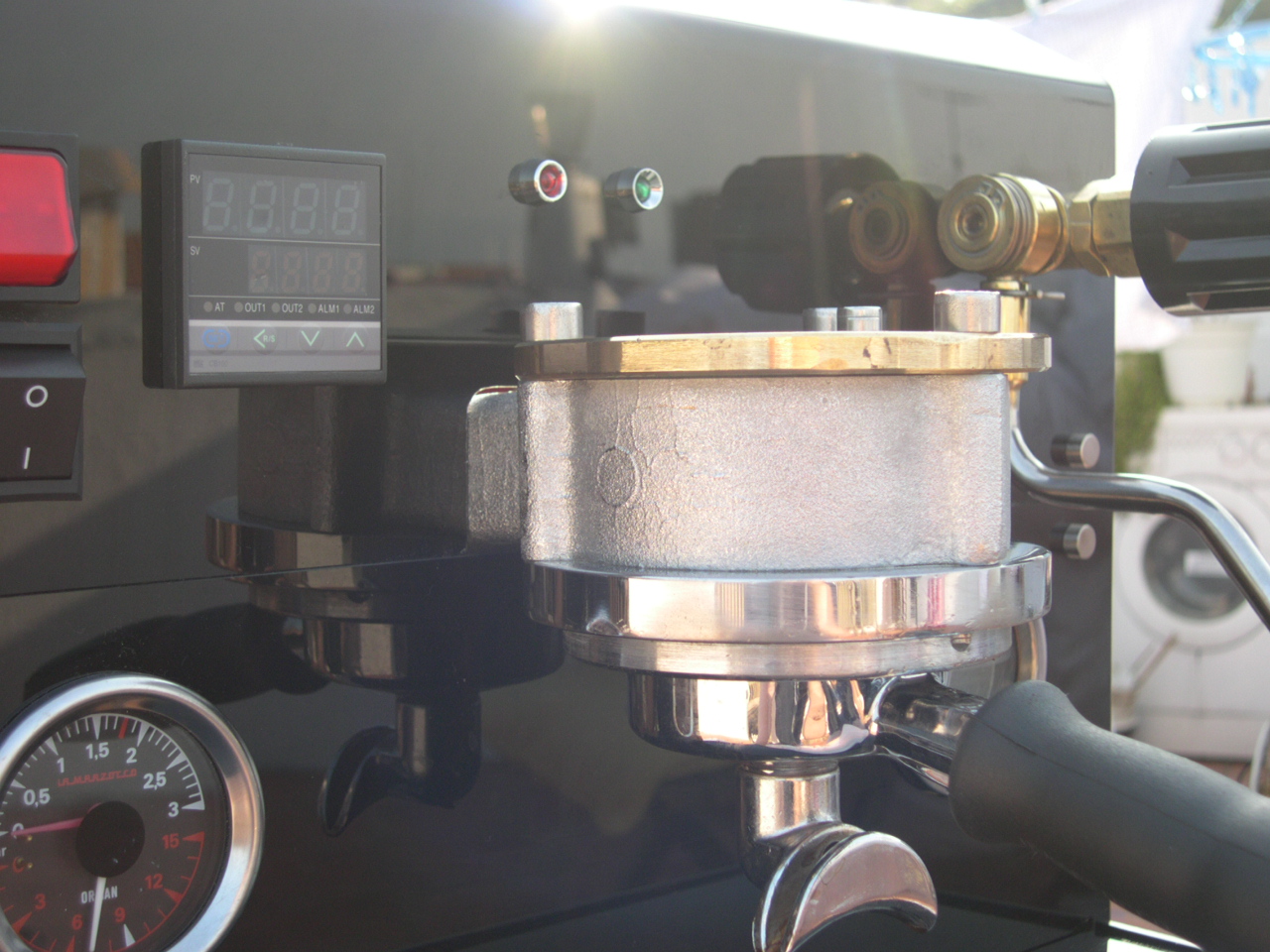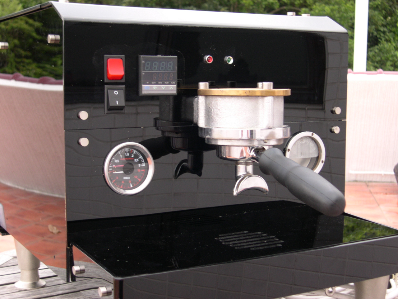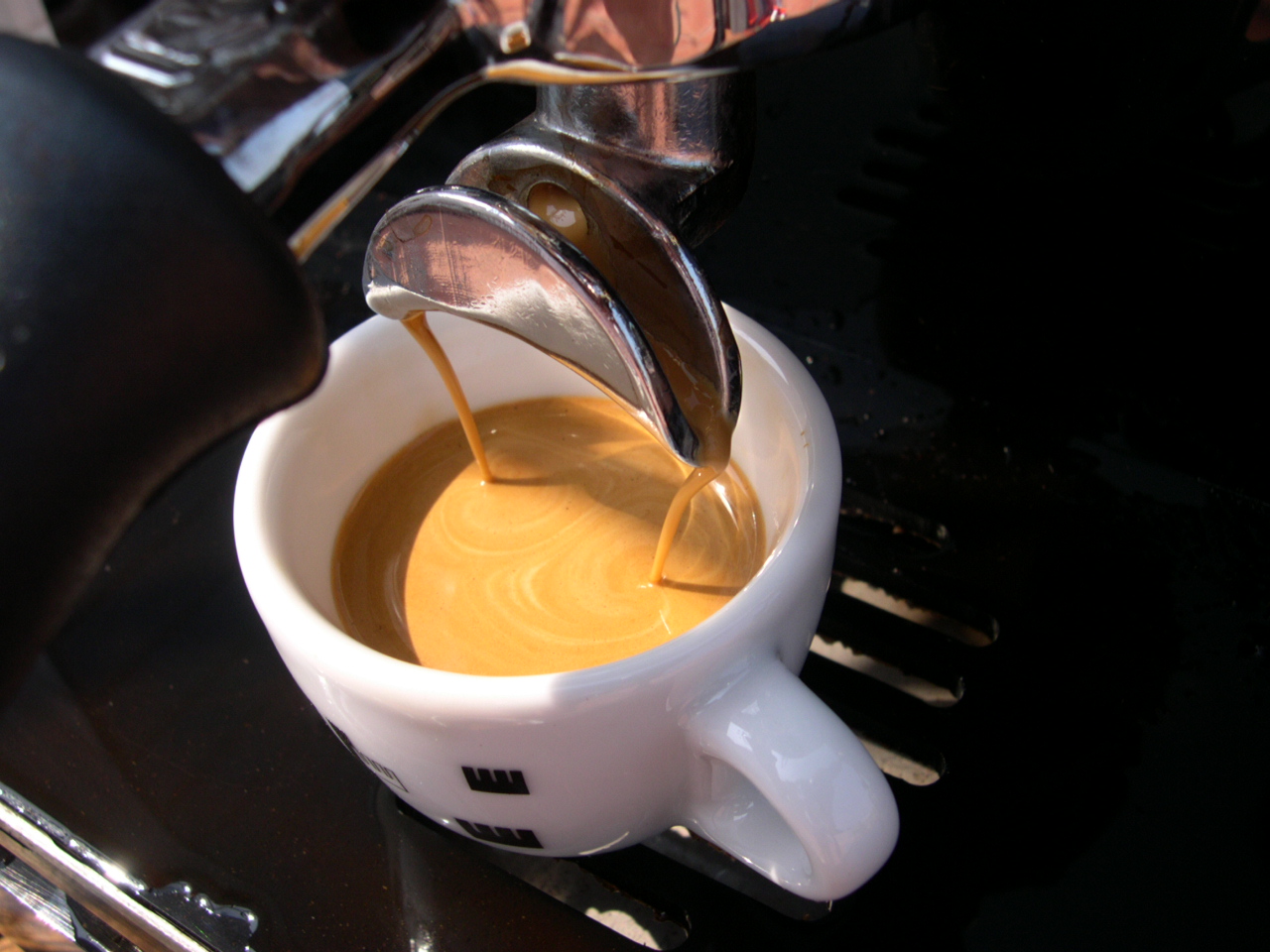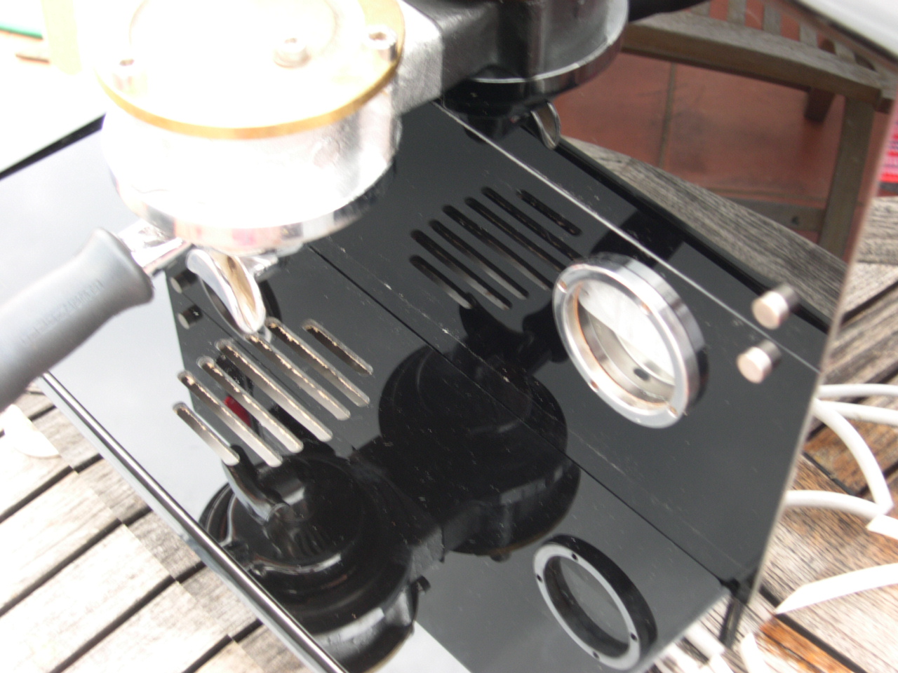 The very first shot Earlier that day I had switched her on for the first time. The wiring was OK in that it didn`t blow anything! and the relief when the autofil clicked on within a couple of seconds of turning on the main switch is something I will never forget. There were also no leaks to adjust for either. To protect the heating elements, there is an isolation on/off switch inside the machine to prevent them being turned on with no water inside the boilers. Once the steam boiler has filled and you have bled the air from the brew boilers you are good to go and switch the elements on. Now I really am not lying but the next pictures are the first two shots from the machine. |