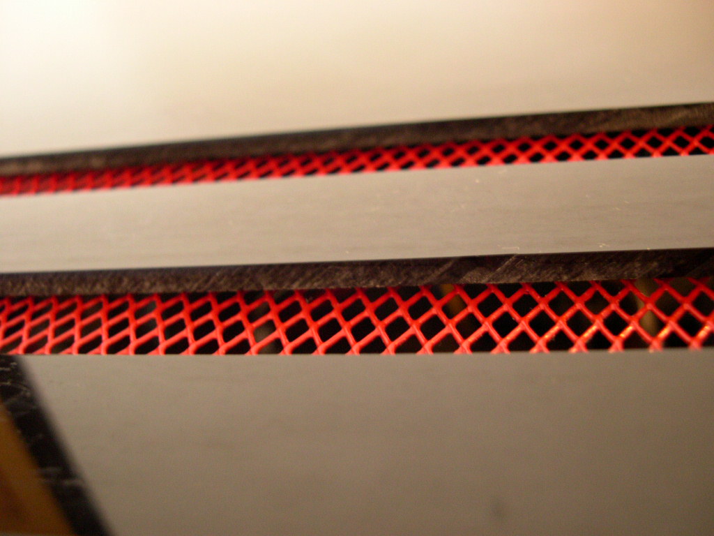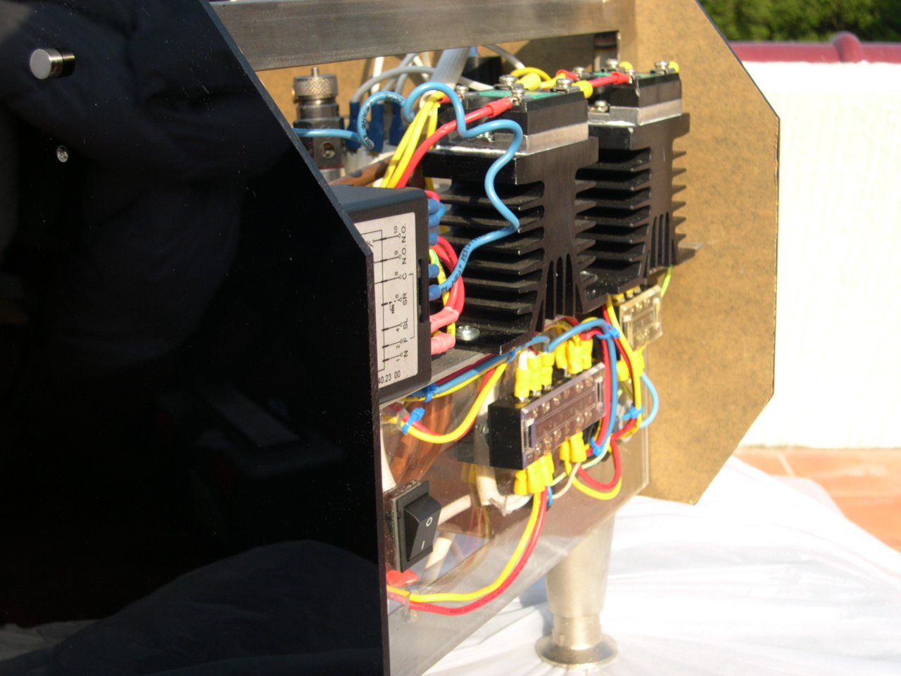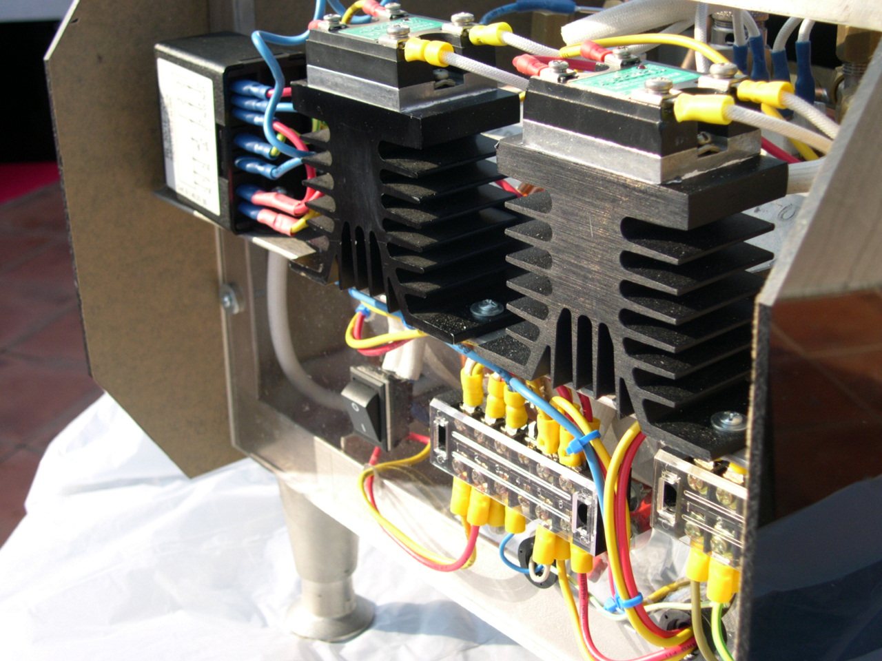The completed machine Version 2 After a few days I added a few new features. My main concern was the internal ambient temperature being too high. Because I had dispensed with a cup warmer I had also dispensed with a means for hot air to escape. In actual fact the machine had no ventilation at all. I then had some side and top vents cut in the panels. I then covered these vents with a red wire mesh. I then installed a small PC fan to give the PID controller some ventilation. The fan and the vents worked great. The SSRs were never in any danger because of those enormous heat-sinks they are mounted on. |