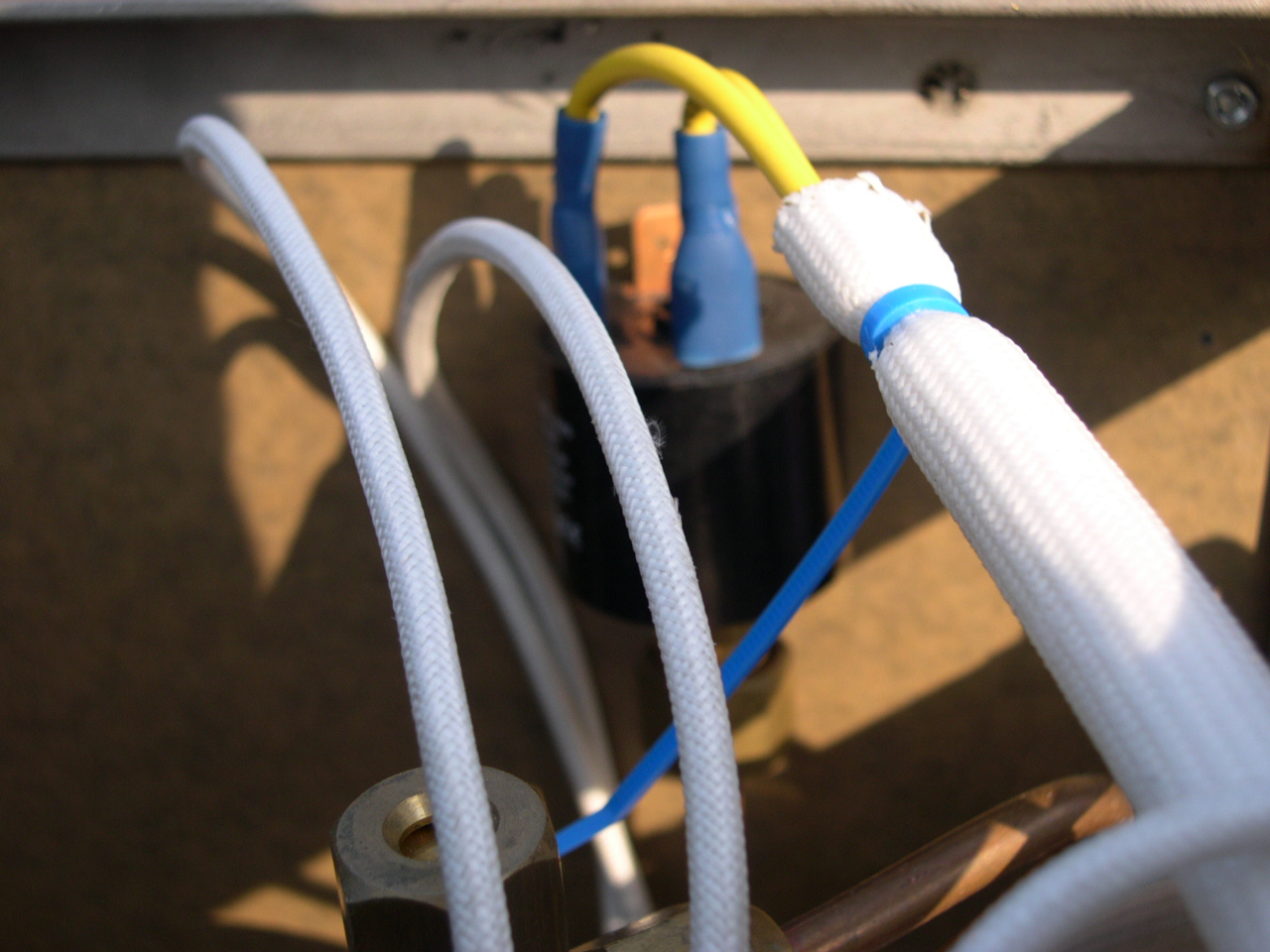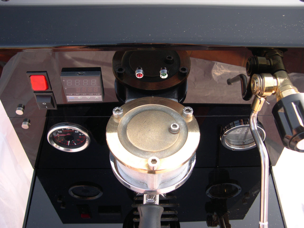 Some personal touches Of course the main benefit of building a machine is that you can get it exactly how you want it. For example I tried to adopt a radical design and dispense with the traditional cup warmer on the top. Cups can be warmed but in a different way. I then adjusted the height of the drain tray to the pour spout by lowering the brew boiler. This meant that I would be able to just slip an espresso cup under the spouts to prevent the break up of the crema. In fact it is pretty tight and even getting a shot glass under there is difficult. I also refrained from a hot water spout. I never use one so I saw no need for one. Another plus of this machine (if you are familiar with Marzocco) is that the awful drain copper pipe from the solenoid has been eliminated and replaced with a silicone rubber hose instead. The solenoid is in a slightly different place than normal. But the main feature of the machine I will say is the electronic panel at the rear of the machine. All of the electronics are located on one panel, the exceptions being the PID controller, the Mains On/Off switch and the brew switch which are all on the front panel. Even then I have designed it in such a way that you undo 4 simple screws and the panel comes away in one piece allowing easy access to the group or the PID connections. It is designed so that you can make adjustments away from the machine rather than poking screwdrivers through tiny holes. The 2 SSRs that handle the switching of the heating elements are again located on the rear panel. They are in that position for 2 reasons. The first being for easy access and secondly to keep them cool out of the direct heat from the boilers. |